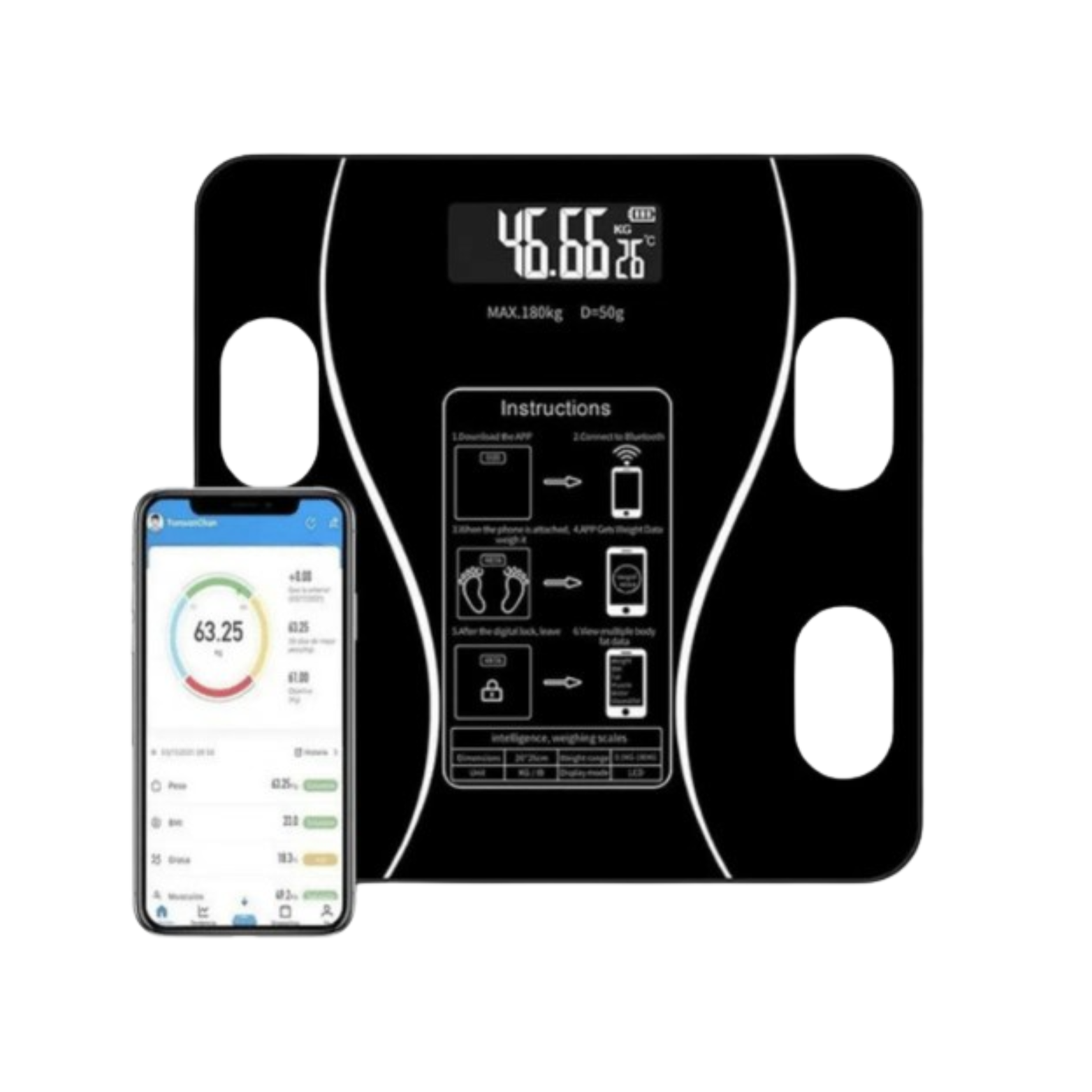 - Realiza mediciones de Peso, Grasa Corporal, IMC (Índice Masa Corporal), Agua, Músculo, Hueso, Tasa Metabólica Basal, Grasa Visceral, Metabolismo, Proteína, Obesidad, Edad, LBM (Peso Corporal magro).